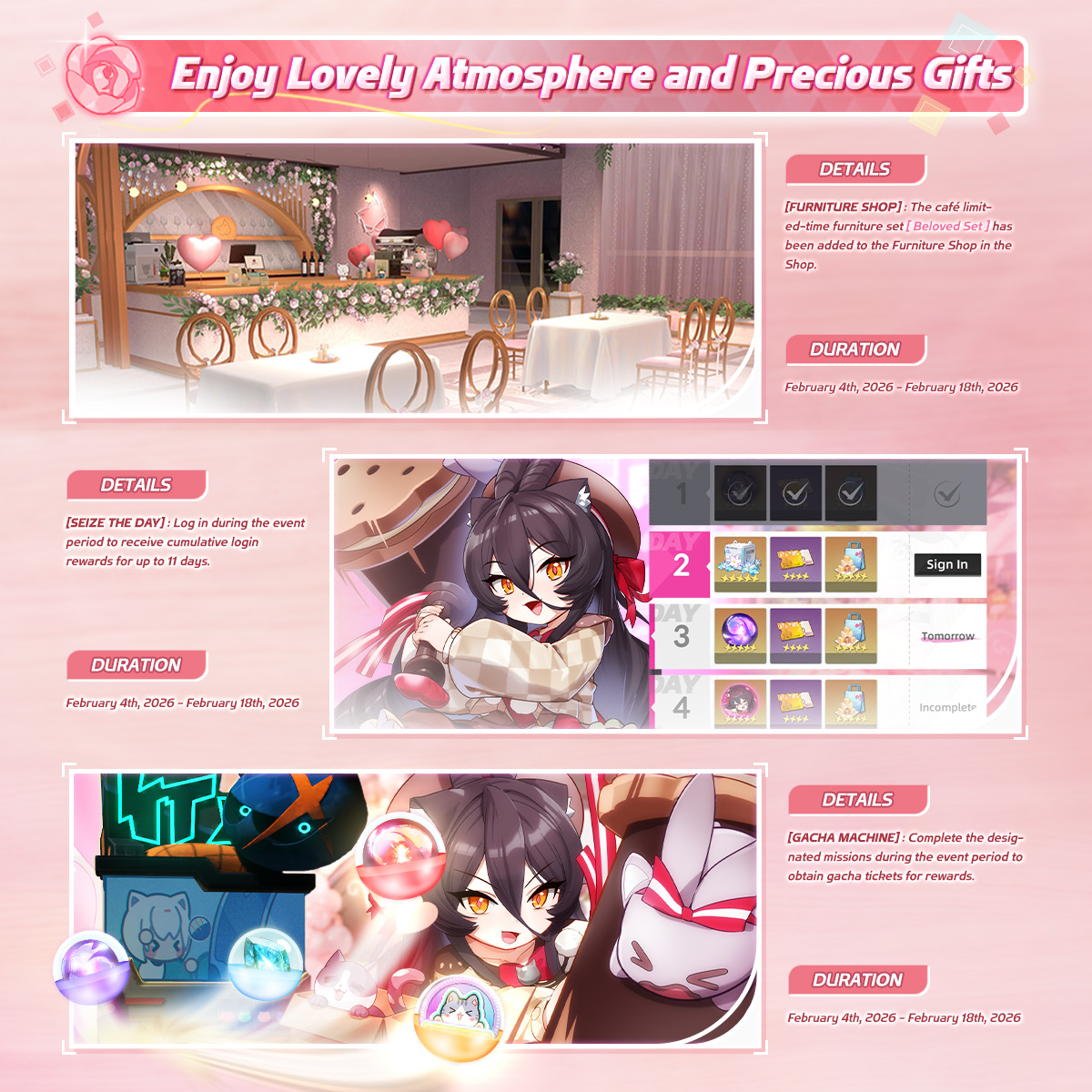 – Event Details: Login each day, complete missions, earn tickets, and spin the Gacha Machine for pawsome rewards!