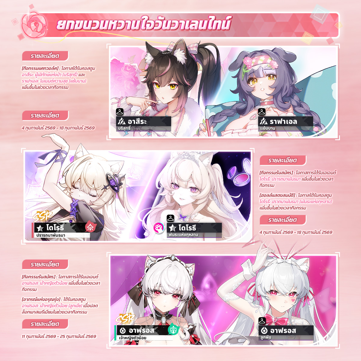 – รายละเอียดกิจกรรม: กิจกรรม “แคทวอล์ค” มาแล้ว! คัดสรร 10 ครั้ง การันตีคอสตูม 1 ชุด นอกจากคอสตูมใหม่อย่าง “อาสึระ: ผู้พิทักษ์แห่งป่า (บริสุทธิ์), ราฟาเอล: โมเมนต์ความสุข (แย้มบาน)” แล้ว ยังมีโอกาสได้รับคอสตูมหายากอื่น ๆ อีกด้วย